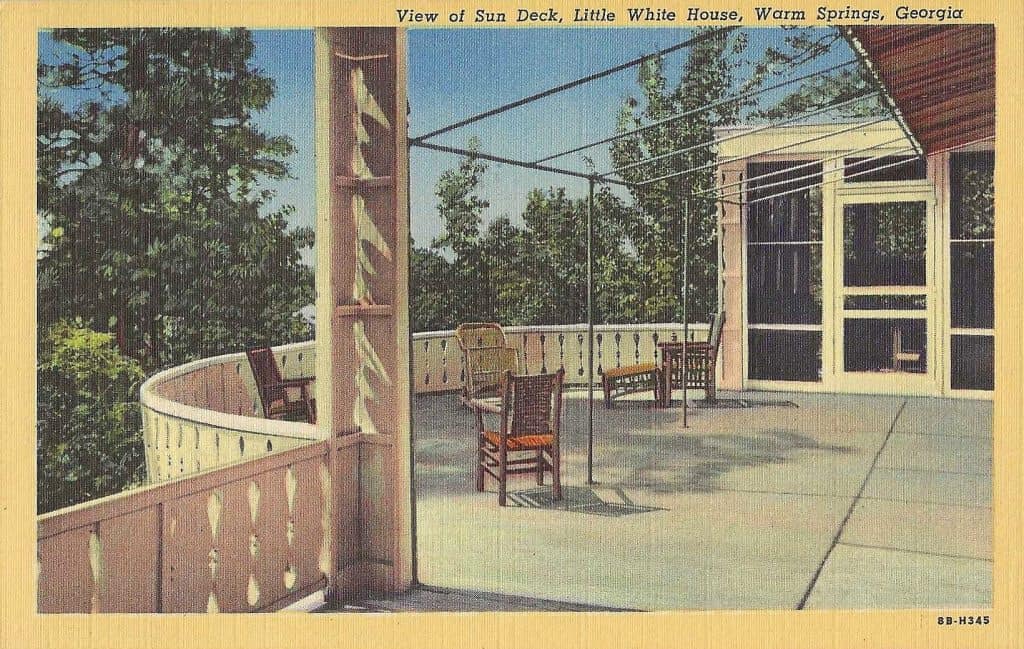 FDR’s first visit to the Little White House was in the winter of 1932-33, just before his inauguration. His new house was finished in 1932 and in essence was a modest, six room one-story cottage. The wood-frame building featured a four-columned central temple form portico. The slightly off-center entrance hall cuts through the combination living room dining room and opens into a bedroom on the left and into a narrow side hall on the right. The living room/dining room is glassed-in on the west side with high windows flanking French doors that open onto a sundeck. Roosevelt enjoyed the serenity of the sundeck’s view overlooking a heavily wooded ravine.