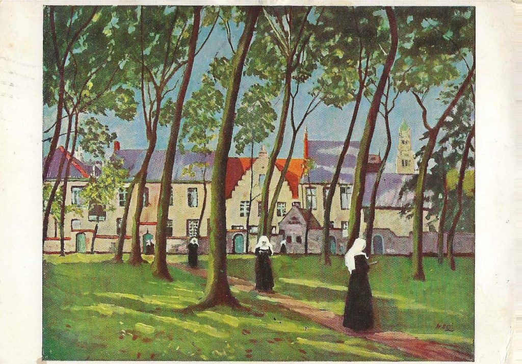 The Beguinage at Bruges is oil on canvas completed in 1946. Beguines were women in the cities of northern Europe, who, beginning in the Middle Ages, led lives of religious devotion without joining an approved religious order. They were so-called “holy women” who first appeared in Liège toward the end of the 12th century. In many cases, the term “Beguine” referred to a woman who wore humble garb and stood apart as living a religious life beyond the practice of ordinary laypeople. Local officials established formal communities for these women that became known as beguinages.