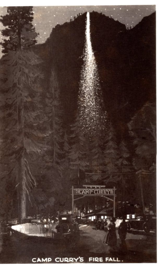 Camp Curry began with seven tents and tent cabins. The staff included a cook and a team of college students who worked in exchange for room and board. The Curry’s emphasized informal hospitality in the form of nightly campfire entertainment and the revival of the Yosemite firefall, a tradition introduced by James McCauley. They advertised “a good bed and clean napkin with every meal” for $2 a day.