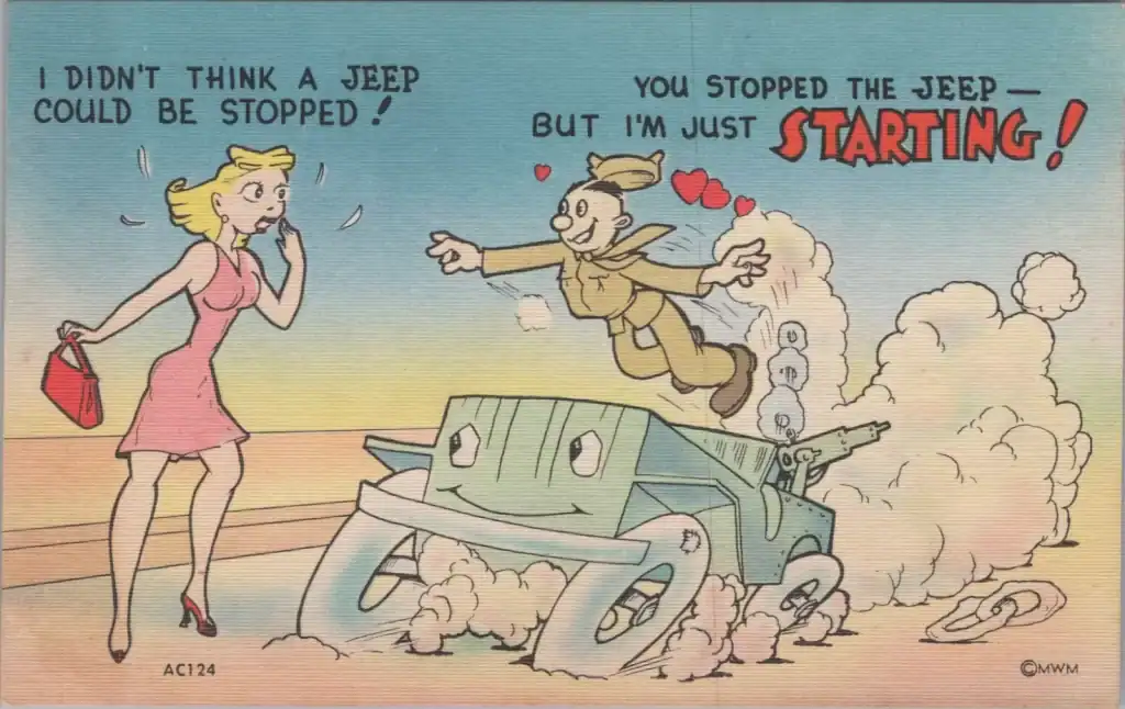 The Jeep made its War Time Comic Postcard debut as soon as it reached a field command station. The samples below prove than nothing was off-limits to the wartime jokesters.