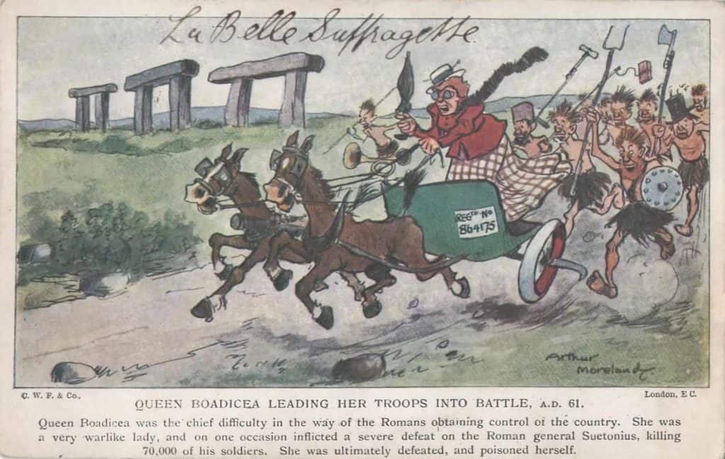 Arthur Moreland, one of Britain’s best-known political cartoonists presents this humorous representation of “Queen Boadicea Leading Her Troops Into Battle, A.D. 61.” The image is likely from Moreland’s 1905 book Humours of History, which is comprised of 160 illustrations that may well be cartoons of his that were previously featured elsewhere.