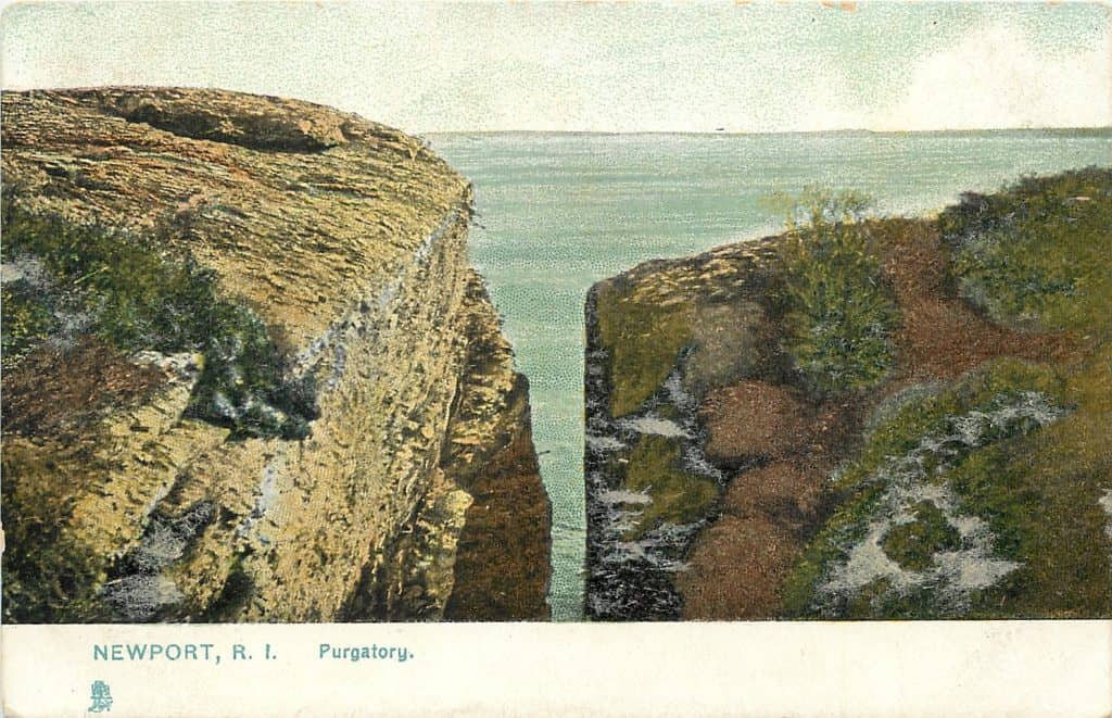 The card caption reads: PURGATORY is the name given to a chasm between the cliffs; it is a vertical fissure, some 50 feet deep, into which, under certain conditions of wind and tide, the water rushes with great force, only to be violently expelled with such terrible noise as to sufficiently explain the name.