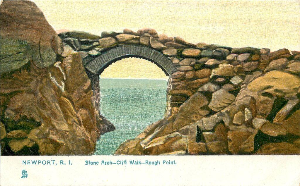 The card caption reads, in part: This stone arch is one of the splendid features of masonry which makes Cliff Walk famous.
