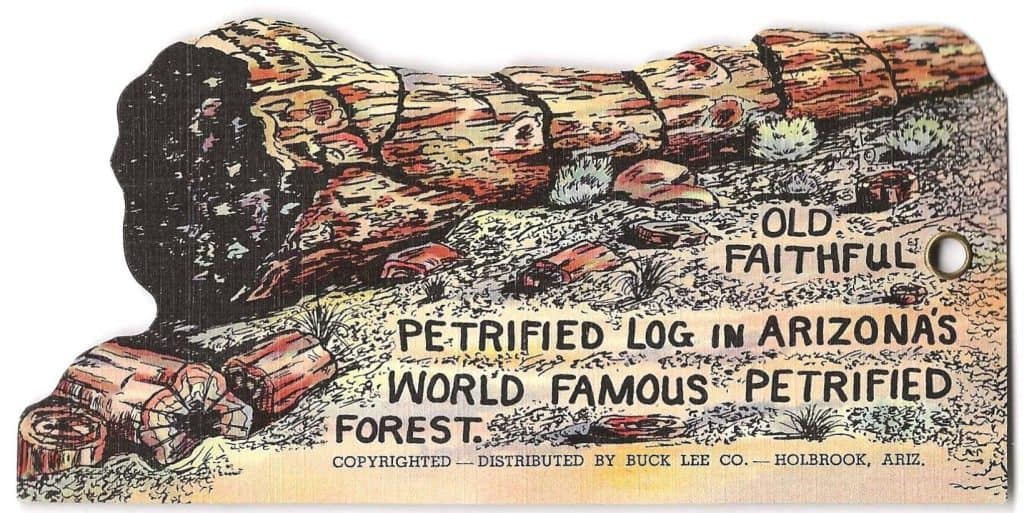 The “Petrified Log in Arizona” postcard is a die-cut creation of the Buck Lee Company in Holbrook Arizona. It was one of several postcard luggage tags that achieved instant popularity.