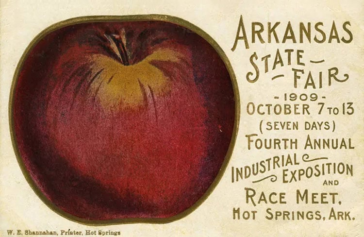 This early Arkansas State Fair “apple” shaped advertising postcard was mailed one month before the fair opened. Mrs. Ethel Cunningham was the 27-year-old wife of Doctor Ben Lee Cunningham who practiced medicine in Dardanelle, Arkansas.