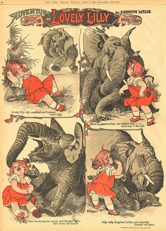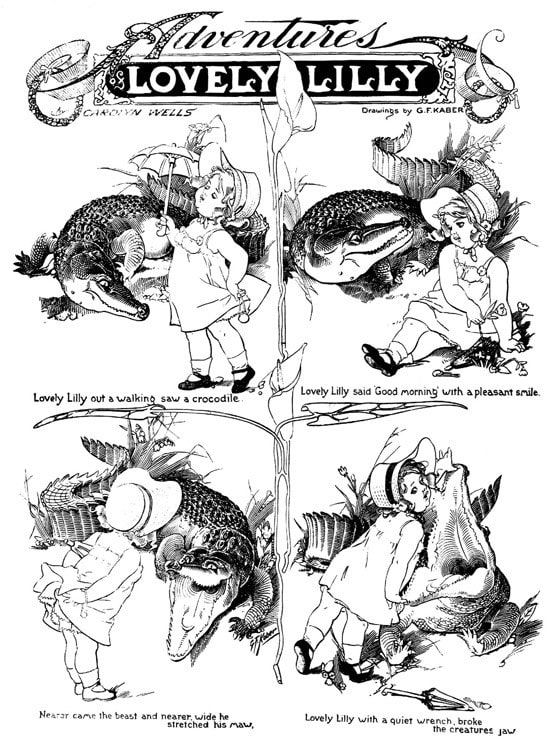 Without debate or doubt, one of the weirdest of Wells’s contributions was the Adventures of Lovely Lilly, which ran in the Sunday New York Herald from December 1906 to January 27, 1907, and again from May to June 9, 1907. The Lilly illustrations were done by George F. Kaber a Philadelphian, born in 1860. He was, indeed, a contemporary of the author.
