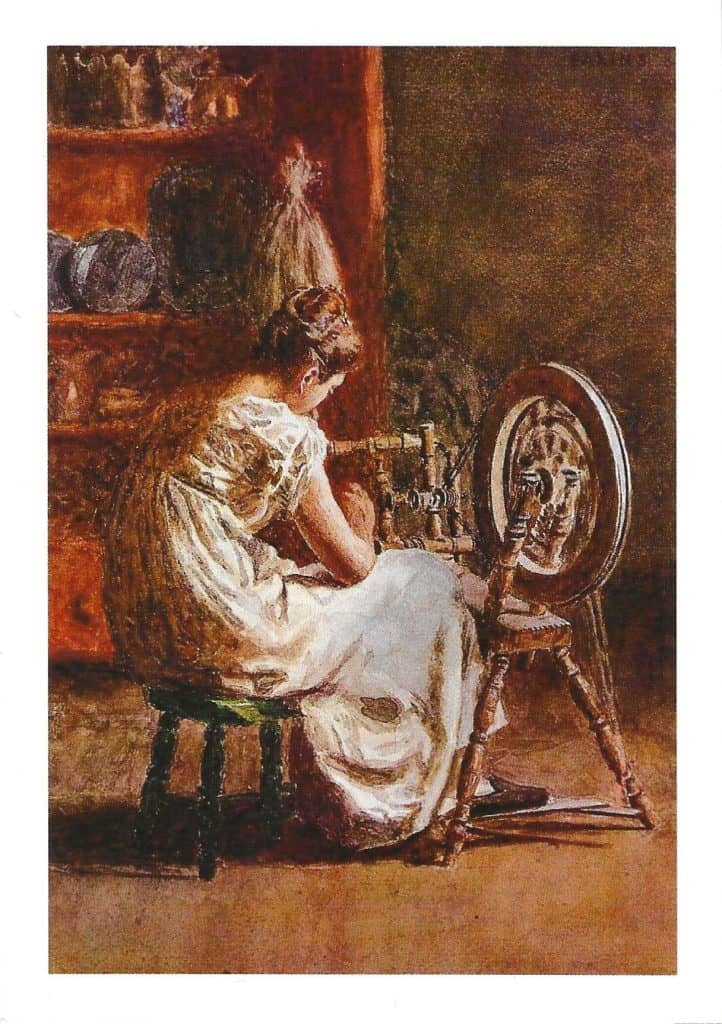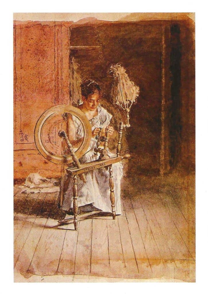 In 1881, a year in which Eakins painted twelve major pieces, Spinning, a relatively small work of only 11” by 8” was the first. It soon attracted the attention of family and friends, and he was encouraged to repeat his effort. Homespun was next. In it a young woman is seen seated on a green stool, attentively engaged in making yarn at a spinning wheel. She is dressed in a white garment that may be a bit outlandish for a work-at-home chore. Her focus is directed entirely on her task.