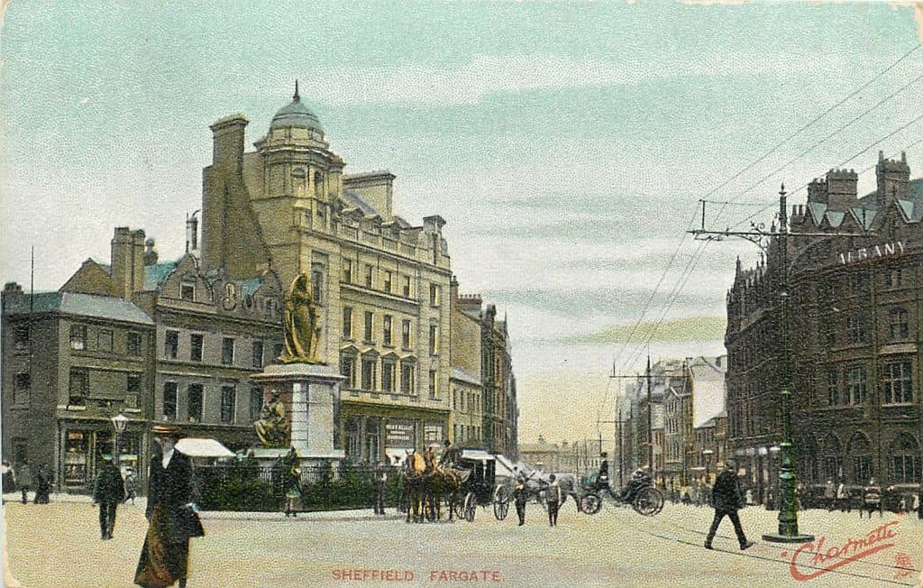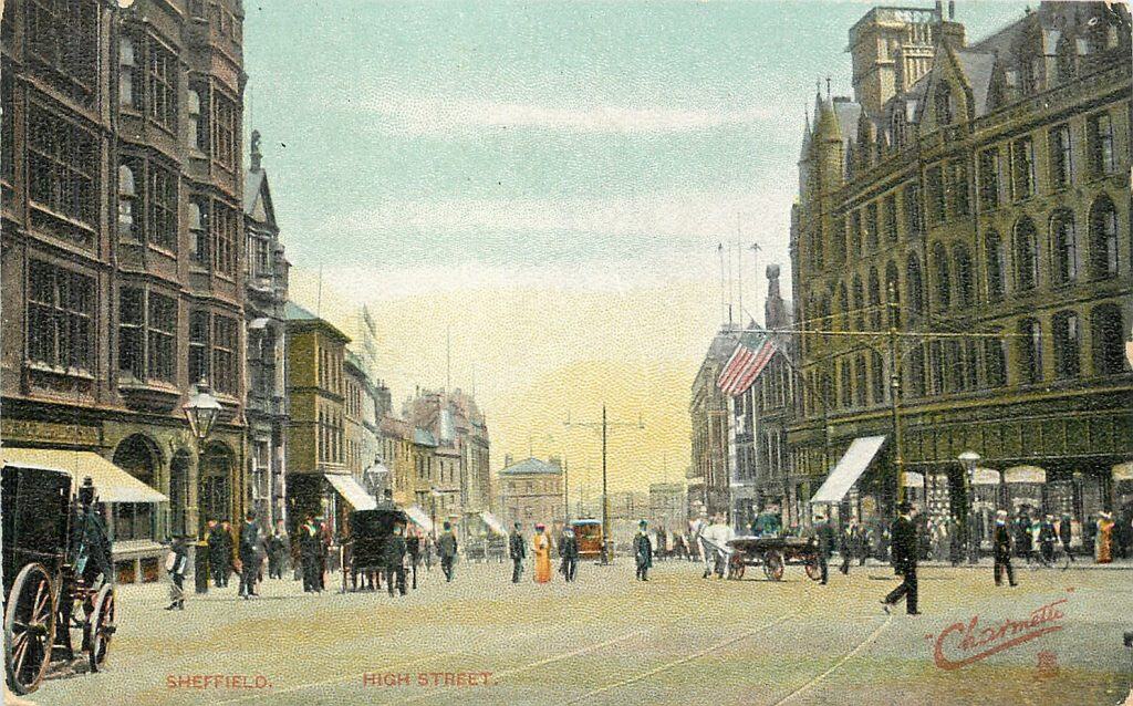 Sheffield has been a popular area for postcard sales because it is the closest hospitality site for Lake District visitors. As early as 1908 Tuck & Sons added a series of twelve cards to their catalog that were part of the CHARMETTE collection. Cards from the series follow: Town Hall, Fargate Square (a famous meeting place), and the High Street.