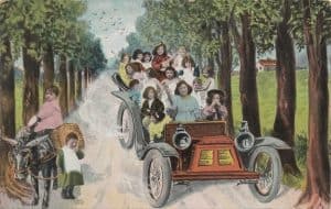 I enjoyed your article and whilst the cards are not typical of my collection I do like this 1905 card as it depicts an early motor car.