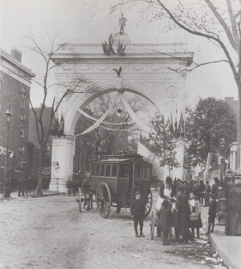 Spanning lower Fifth Avenue a half block north of the park, the temporary arch featured clusters of flags and streamers of bunting topped by a wooden statue of Washington.