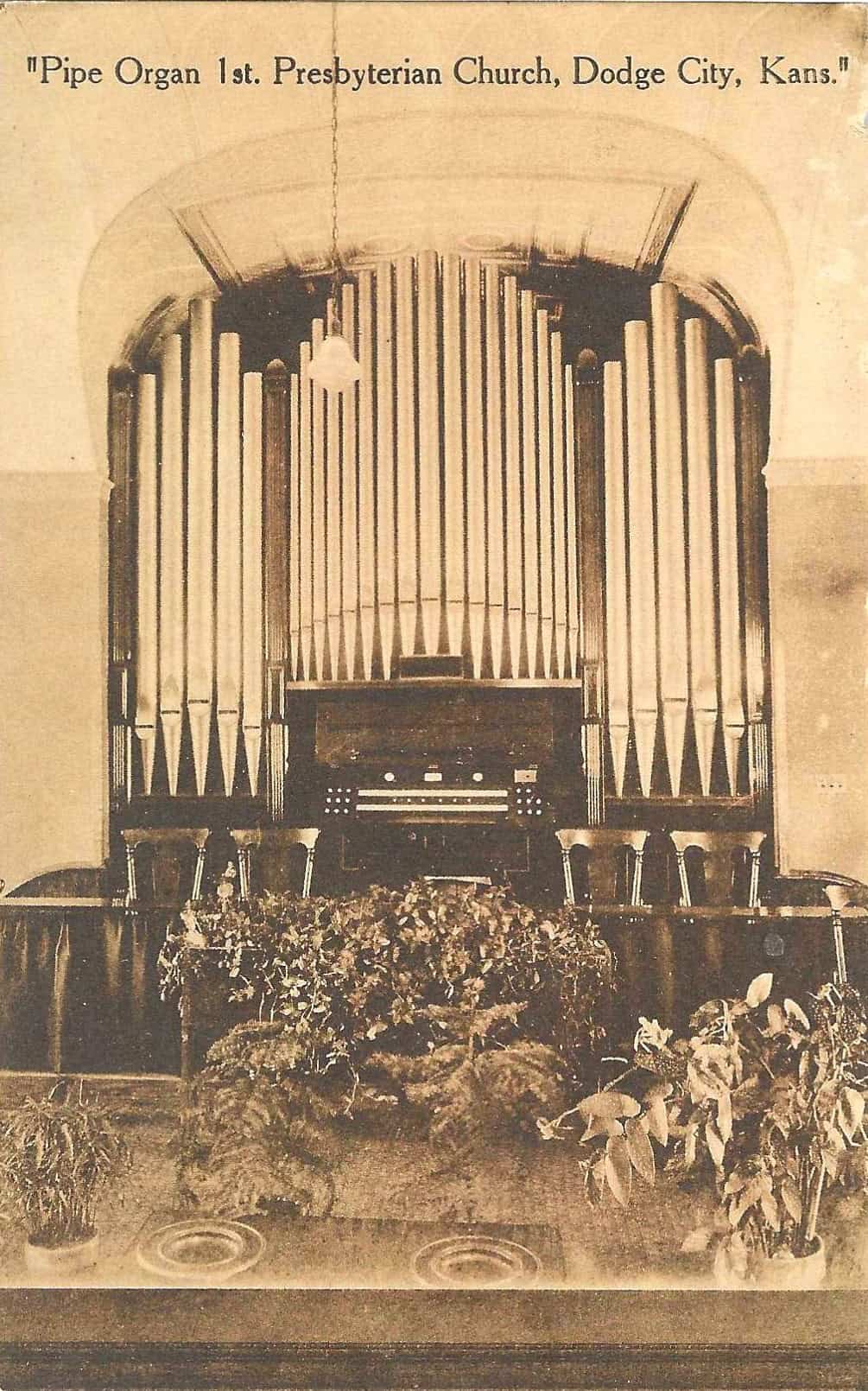 The most difficult job I was ever assigned was the replacement of the 26-foot-long E-flat pipe in the left rank seen on this postcard. I had to work from the top of a thirty-foot ladder that was held in place by two pieces of two-by-four lumber nailed to the floor.