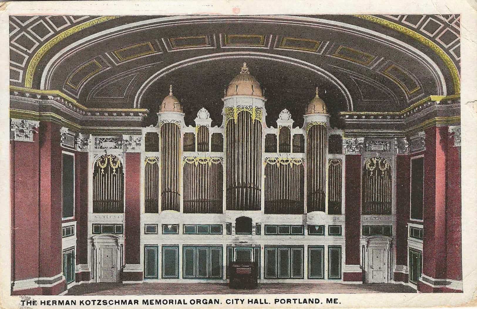 The Kotzschmar organ is in Portland, Maine, at the Merrill Auditorium. It was built in 1911 by the Austin Company; it carries serial number 323. The Austin Company also built the organ in Balboa Park. This postcard shows the organ around 1912, just two years after it was donated to Portland by Cyrus Curtis, the founder of the Curtis Publishing Company. Curtis’s donation was intended to honor Hermann Kotzschmar, a family friend after whom he was named.