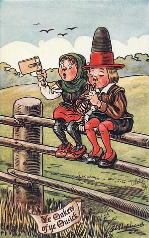 G.E. Shepheard (not to be confused with E.H. Shepherd, the prominent English illustrator of A.A. Milne’s Winnie-the-Pooh and Kenneth Grahame’s Wind in the Willows) early in the twentieth century created a six-card set devoted to the days of old when everyday was a new adventure.