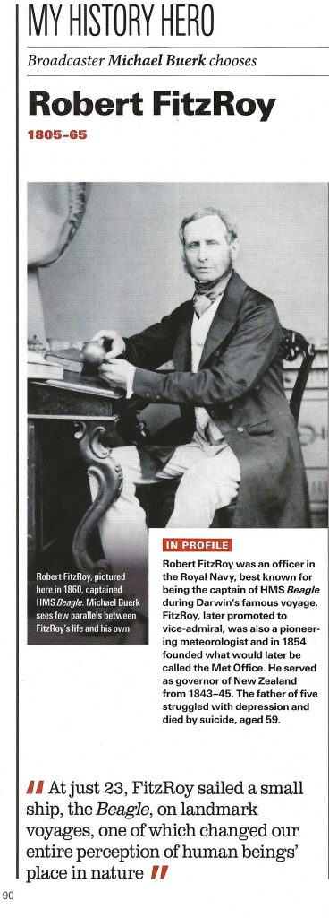 I enjoyed every article, then when I got to the last page, I discovered a feature article entitled “My History Hero” by a BBC contributor named Michael Buerk. Mr. Buerk had entitled his character study with his subject’s name and dates: Robert FitzRoy, 1805-1865.