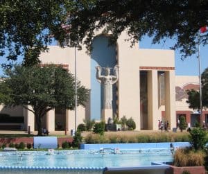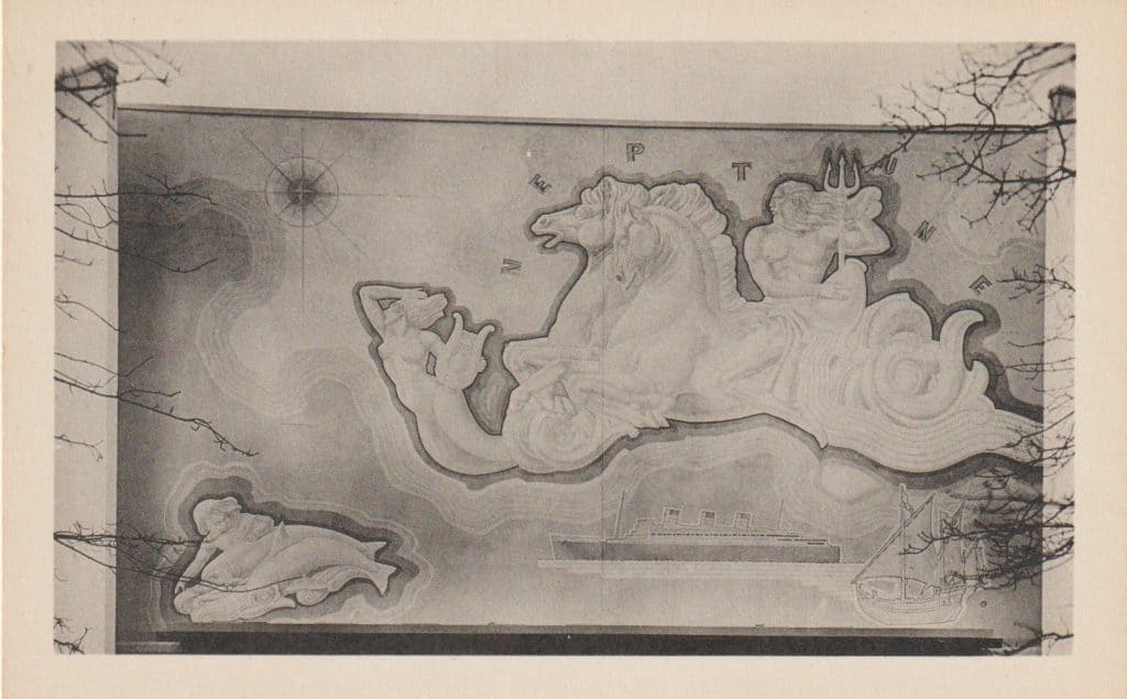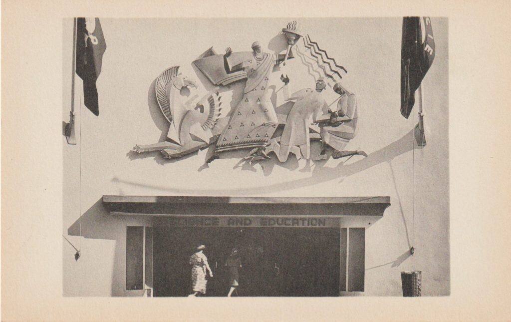 Hippocrates banishes Superstition was sculpted in aluminum and brass by Hildreth Meière (1892-1961) and was located at the Fair’s Science and Education building. This sculpture was approximately fourteen by twenty-one feet in size. Meière was one of the most acclaimed American muralists of the twentieth century. Between the 1920s until her death in 1961, she blended influences from Byzantine mosaics, Egyptian wall painting, classical Greek vase painting, and Native American beadwork into the Art Deco style.