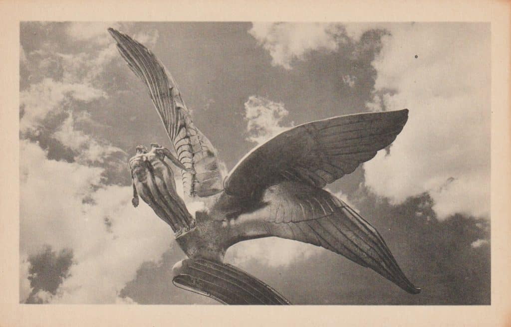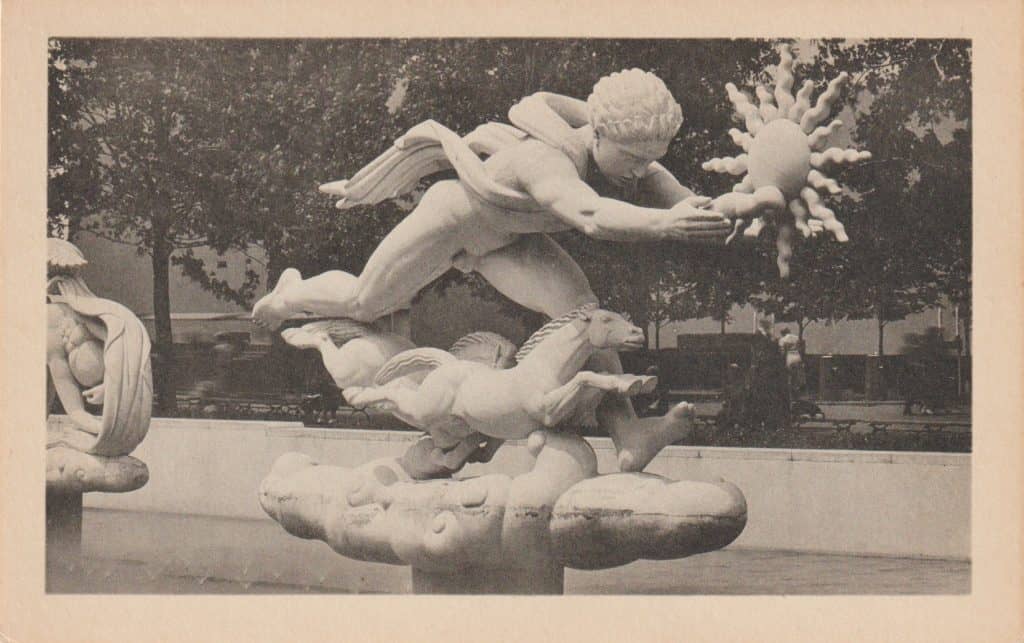 Wings, sculpted by Gertrude Vanderbilt Whitney (1875-1942), was located on the Fair’s Times Square. Whitney was an American sculptor, art patron and collector, and founder in 1931 of the Whitney Museum of American Art in New York City. She was a prominent social figure and hostess, who was born into the wealthy Vanderbilt family and married into the Whitney family. This postcard was displayed in the recent exhibit Art Deco City: New York Postcards from the Leonard A. Lauder Collection at the Museum of the City of New York.