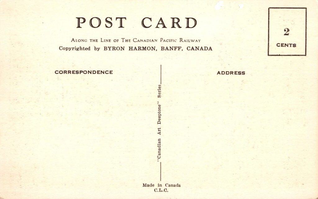Postcards of Canada’s most beautiful sites are plentiful. One manufacture who produced some of the most collectable cards was Byron Harmon. Harmon created over 6,500 photos in the Canadian Rockies. He was born in Tacoma, Washington, in 1876. He started his career as the proprietor of a photo supply store, but in 1903 he moved to Banff, Alberta, and stayed. Over the next 30 years Harmon became a leading citizen of Banff, founding the local Board of Trade, the Rotary Club, and serving in municipal government.