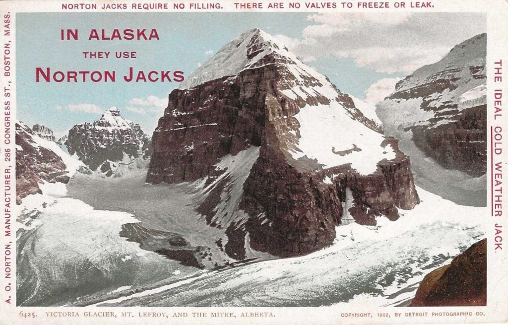 Not to belabor the point, but all four edges of the card carry text. Some important, some perhaps not important. The text on the left edge reads that the product being advertised is manufactured by A. O. Norton. By reading across the top we learn that Norton “jacks” require no filling, and they have no valves. On the right edge we see that Norton “jacks” are ideal for use in COLD WEATHER. Along the bottom edge we can see that the illustration is Victoria Glacier, Mt. Lefroy, and The Mitre, [in] Alberta.