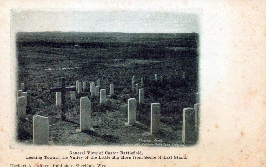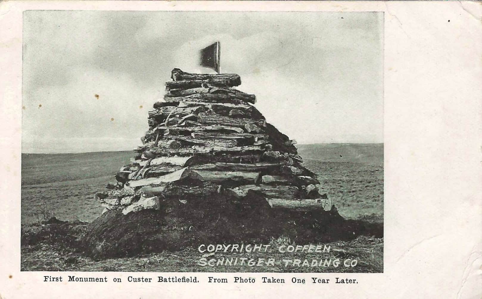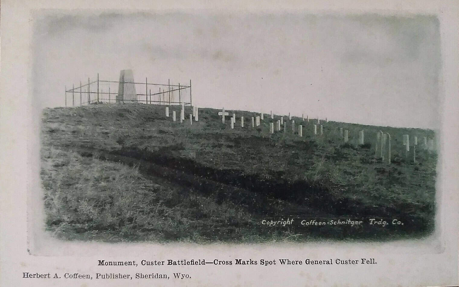 Coffeen and Schnitger Trading Company postcards. Apparently, there is no shortage of the Coffeen and Schnitger postcards showing the battlefield at Little Bighorn. They were issued either late in the nineteenth or early twentieth century. Each is easily identified since the known cards are in the same black and white format with a copyright scratched into the negative and an informational (or site) caption on an edge. Samples of these historical records may be seen here.