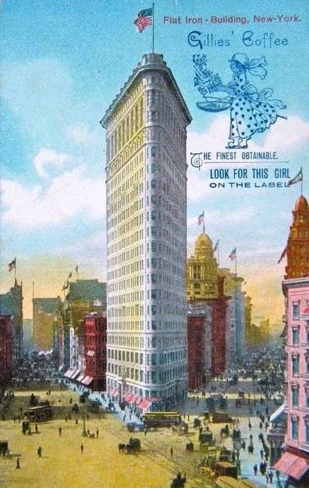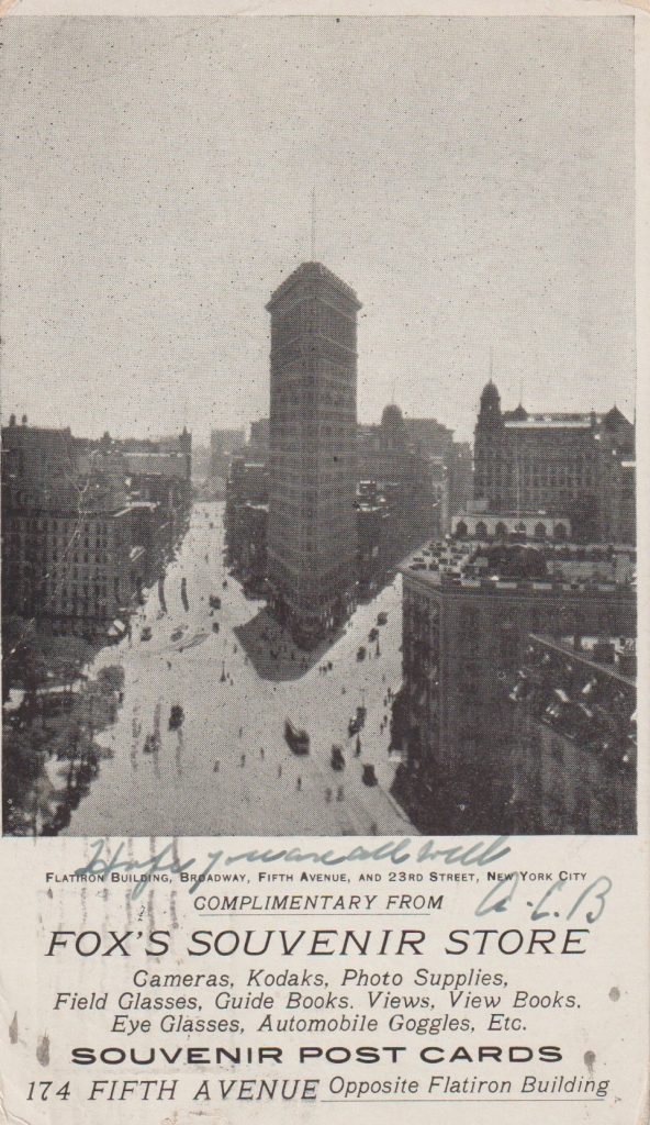 This article showcases a smaller, less common type of Flatiron Building postcard – marketing postcards. These interesting and diverse postcards trade off the iconic nature of the building, or they advertise the building itself, or show the location of businesses in or near this building.
