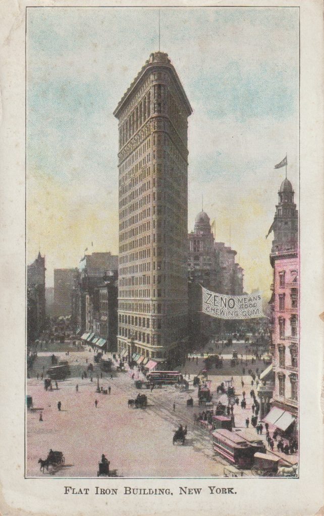 Between 1902 to about 1912 many postcard publishers featured views of the triangular 22-story Flatiron Building (originally known as the Fuller Building) in New York City. The building was an eye-catching early skyscraper located at the busy intersection of Fifth Avenue, Broadway and 23rd Street. Most “Flatiron” postcard views are of the building looking south. Many having a comic theme related to this windy corner or courting couples or cheating husbands caught in the act or a pun on the building’s name.