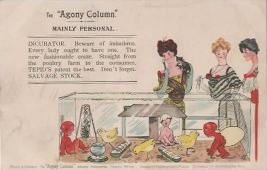 There is a fair chance that each card features an illustration by George Fyffe Christie and that the cards were styled to misrepresent genuine notices that appeared in a newspaper’s Agony Aunt advice column. They are similar in style to the Addled Ads cards which were also published by Misch & Stock. The “Ads” series were meant to mock newspaper classified ads and were also the work of George Fyffe Christie.