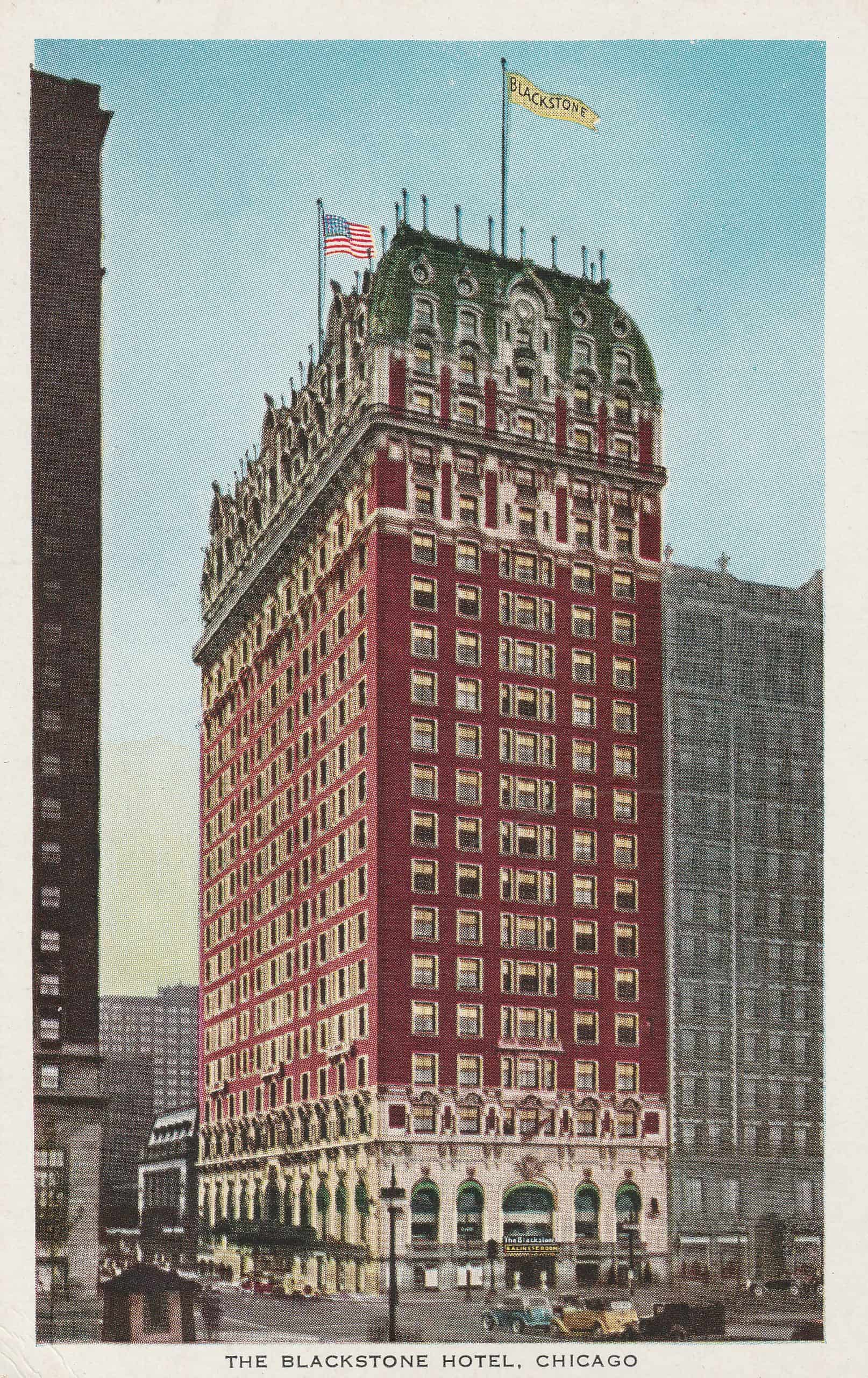 The twenty story Blackstone Hotel is located on the corner of Michigan Avenue and Balbo Drive in Chicago. It opened on April 16, 1910. It prospered in the early part of the twentieth century due to its location near Grant Park, the Chicago Coliseum, and theaters. It has a special tenth floor Presidential Suite that hosted a dozen U. S. Presidents.