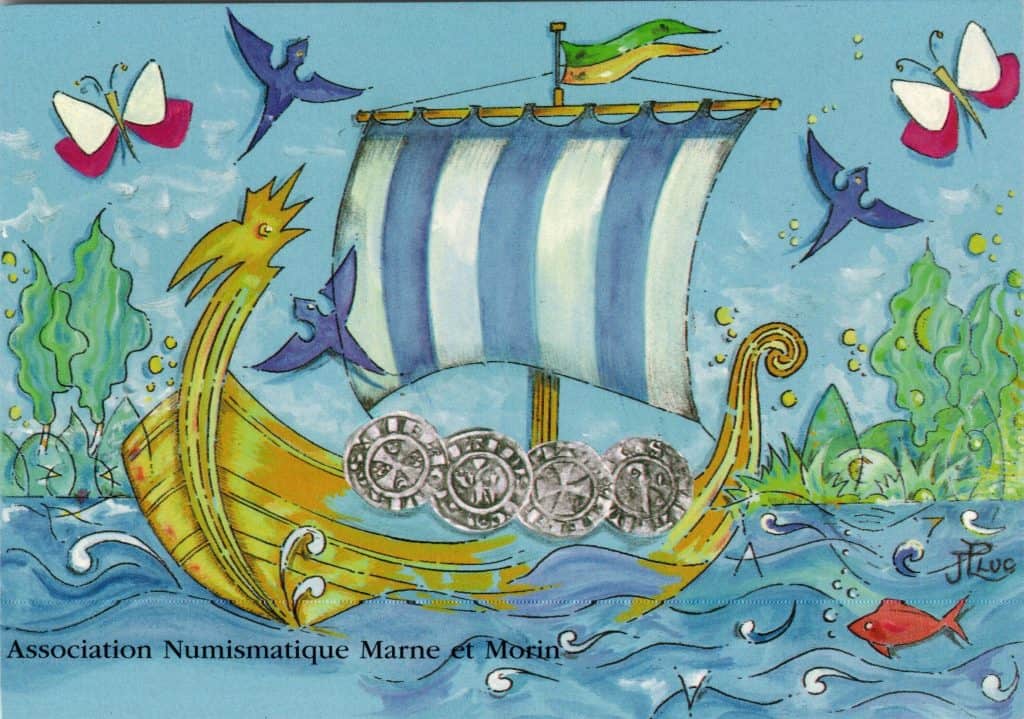 The sample (above, right) is for a numismatic event showing a Viking ship under sail with coins. Often, information such as a date of the postcard is found on the address-side in Roman numerals.