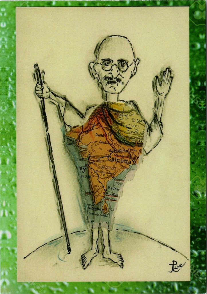 In 1966 Perrigault went to Paris for his studies and in 1996 he began working at “Institut Géographique National” where he was in a world of maps. This influence can be seen in his design of postcards like Gandhi.