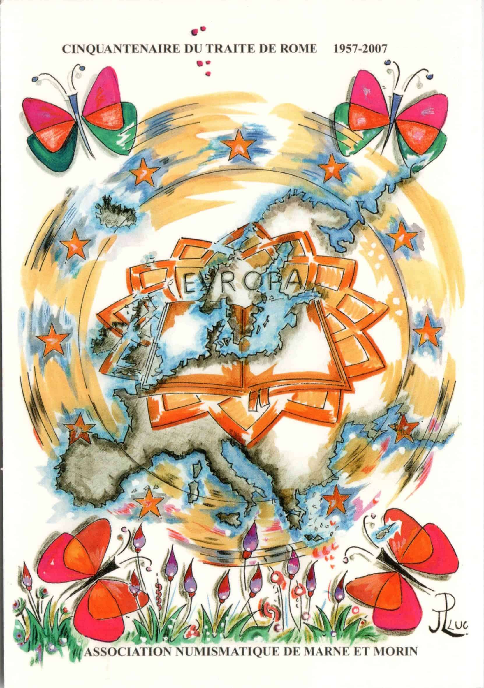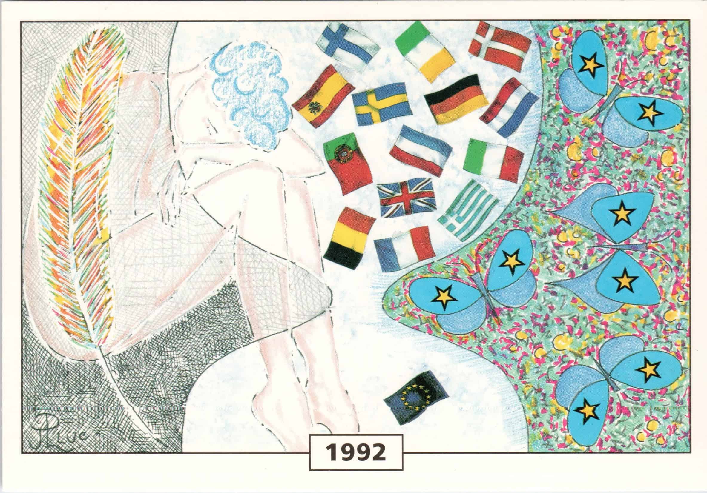 Others of Perrigault’s postcards are more political such as these examples that celebrate the fiftieth anniversary of the Treaty of Rome in 2007 and the 1992 Maastricht Treaty that established the European Union.