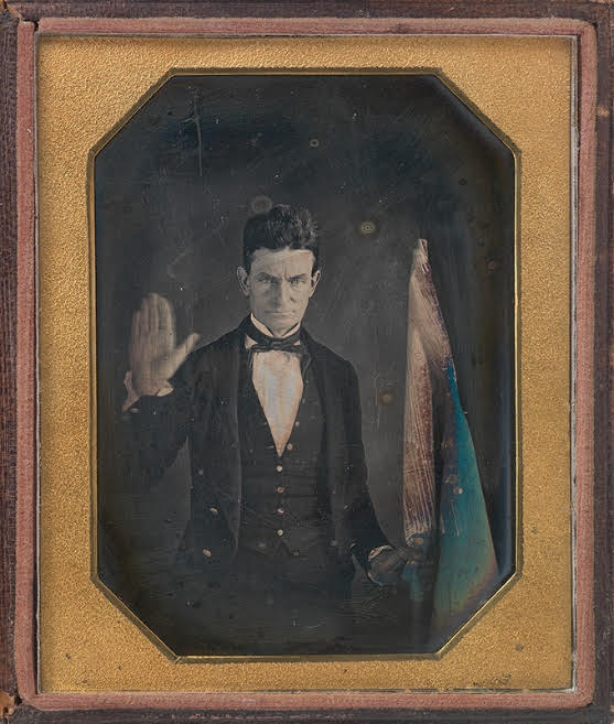 Photo of John Brown taken by African American daguerreotypist and fellow abolitionist Augustus Washington between 1846 and1847. His pose may dramatize his antislavery activism, as Brown’s right hand could be reciting his public pledge to dedicate his life to the destruction of slavery while his left hand holds what may be the flag of the “Subterranean Pass Way,” his militant alternative to the Underground Railroad.