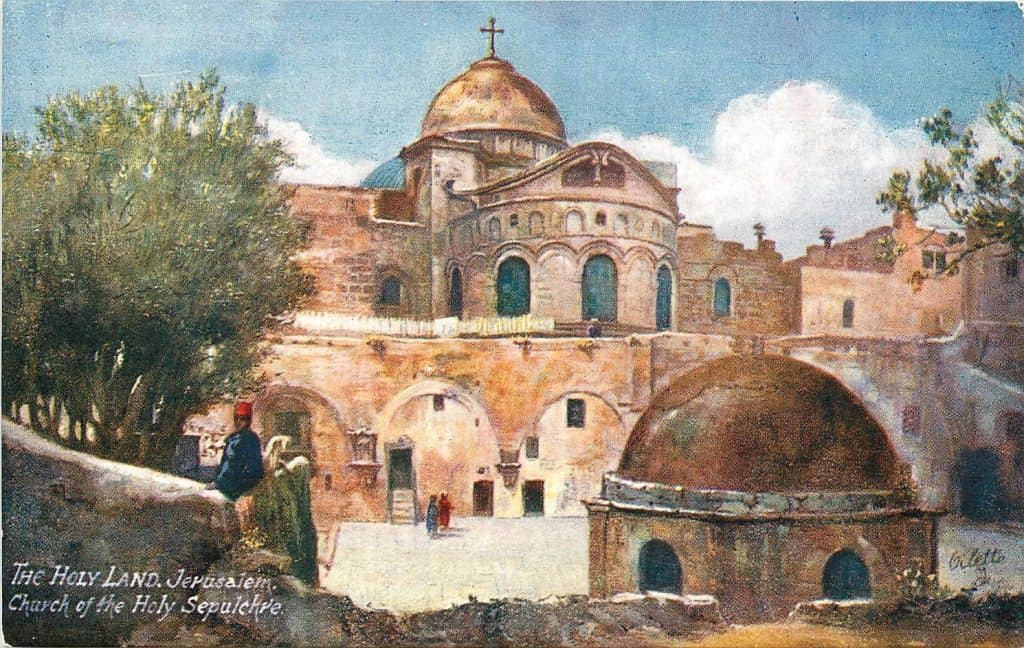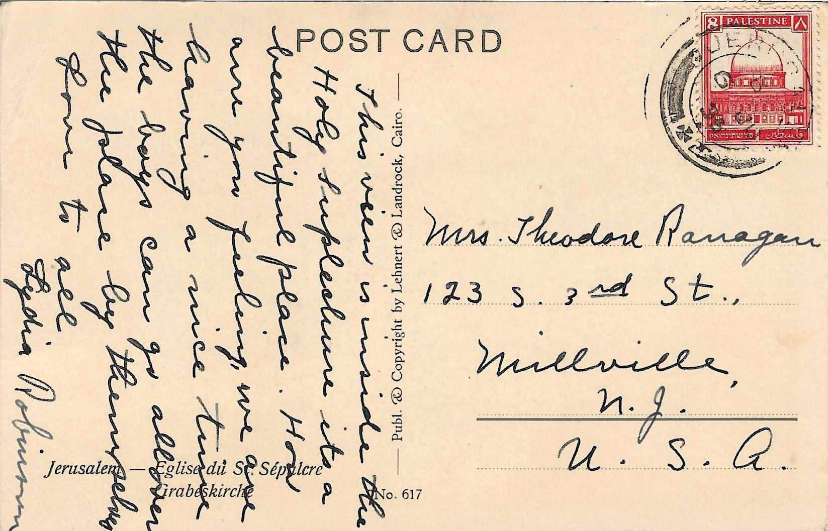 This postcard, a product of Lehnert & Landrock, Cairo, likely the most well-known postcard publisher in Egypt, travelled nearly 6,600 miles, to reach its destination through the mailing process without a bend, tear, or broken corner. The caption is in French and German. The message, however, is clear – “… the Holy Sepulchre is a beautiful place.”