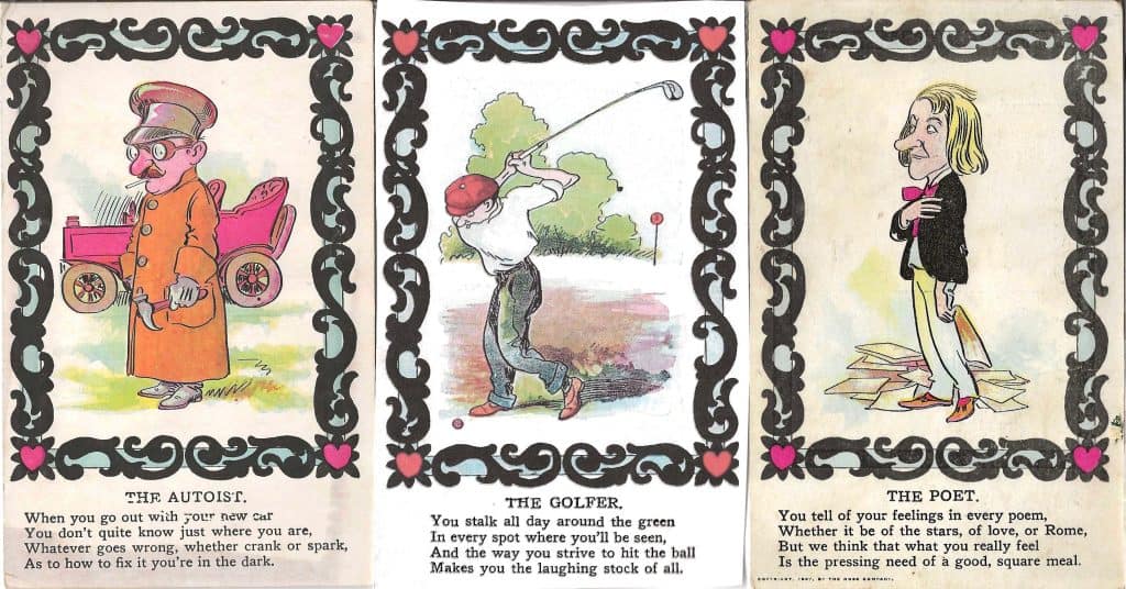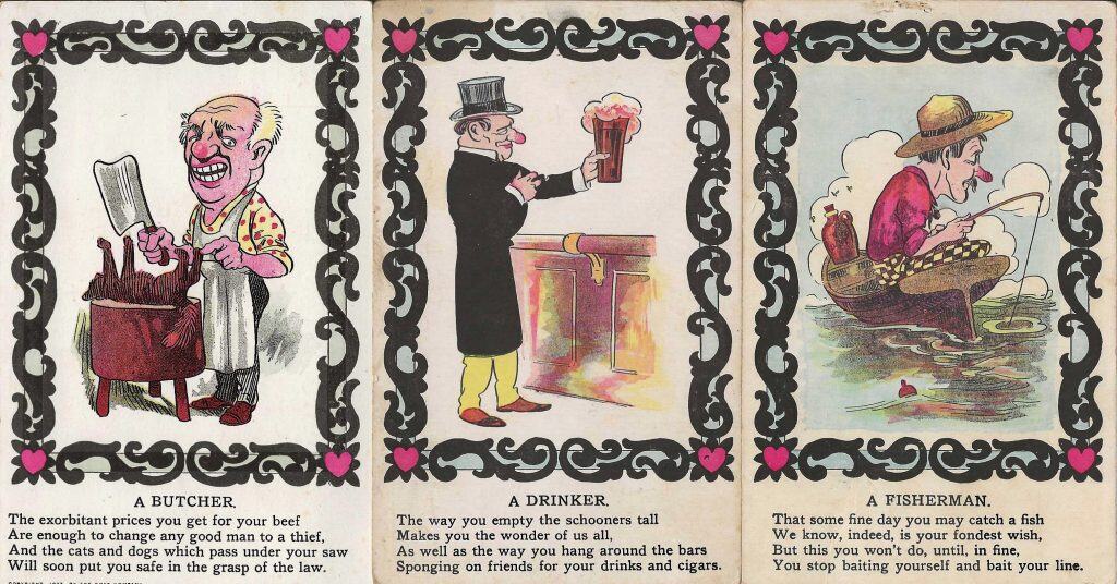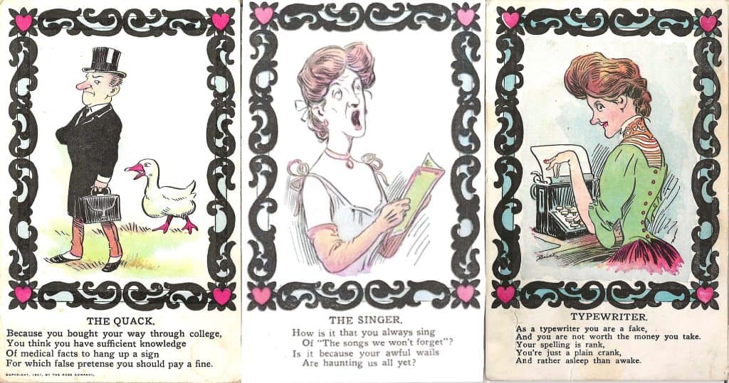 One bit of history that cannot be ignored is the cost. They were cheap to produce. Typically printed on one side of thin paper, they cost only a penny, making them accessible to almost anyone. The cards featured caricatures, crude drawings, and short insulting rhymes. Unlike ornate lace-trimmed valentines, the vinegar varieties were deliberately plain. Why they were so popular for such a long time – nearly ninety years – is a question for the sociologists.