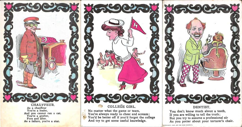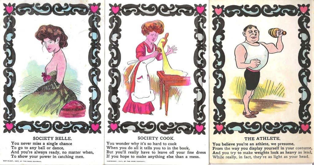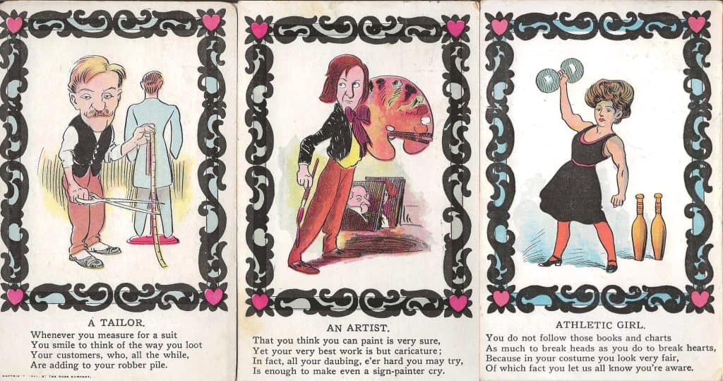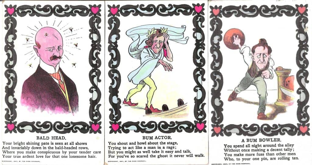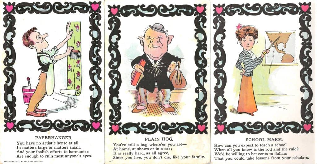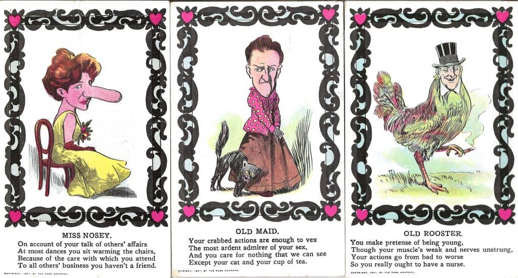 While humorous to some, many recipients found Vinegar Valentines humiliating. Even postal workers complained about handling the flood of offensive cards each February. The insults never ended: women were mocked for their appearance or marital status; men were ridiculed for laziness, arrogance, or drunkenness.