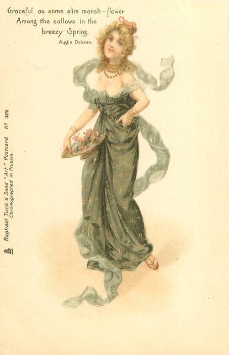Because of this historic neglect it is nearly impossible to identify a time when women could appear in public settings in dresses that were both classy and revealing. And, when that time came in the first few years of the twentieth century, no person, association, sisterhood, nor business missed an exploitive opportunity. Raphael Tuck & Sons was at the head-of-the-line when they published this “Art Series” that were first used in 1903.