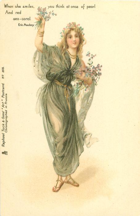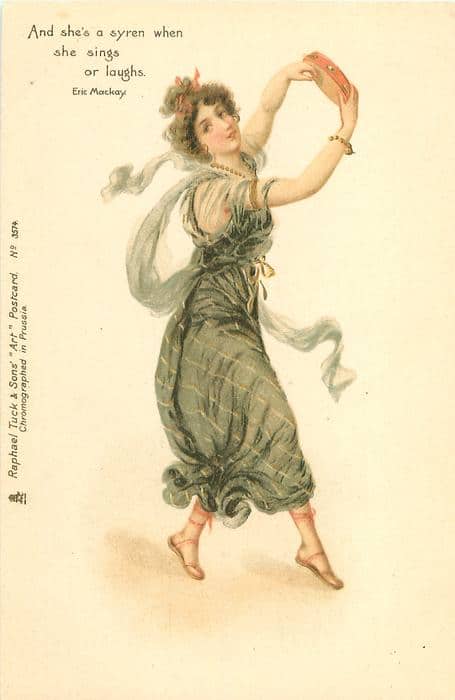 Please indulge this personal note. This card is one of a Tuck six-card set, I found at a Postcard Fair last year, just before the Summer Bank Holiday. I was gobsmacked at the resemblance to my daughter the night she left home with Bobby Essington for their Leavers’ Formal. For you Yanks, a “Leavers’ Formal” or “Leavers’ Ball” is what you call a High School Prom. The cards are magnificent and they bring back a flood of memories.