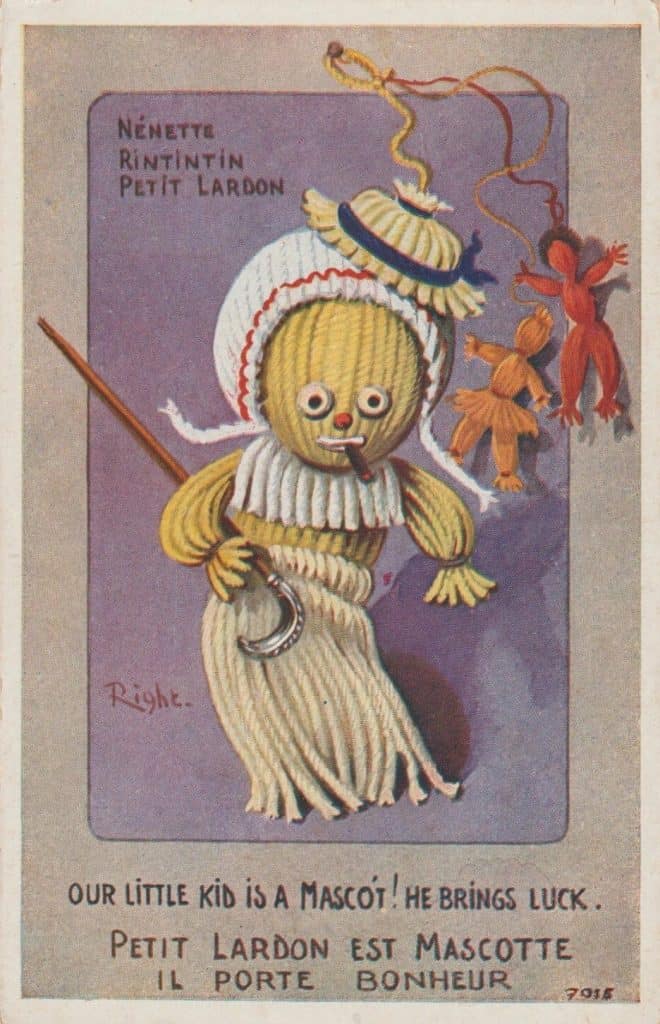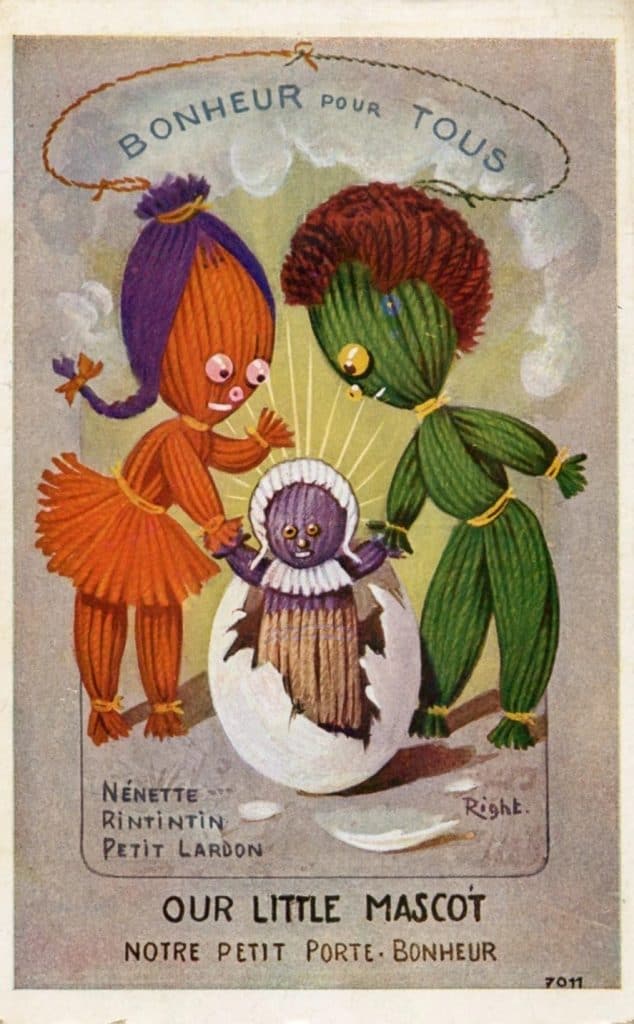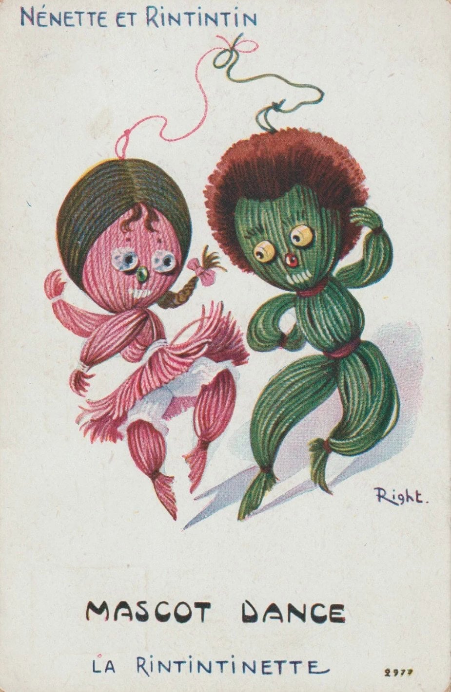 If you planned a day-out along the Champs-Élysées, around the Place Vendôme, or down the Avenue Montaigne in the last months of World War I, you would have seen hundreds of tiny woolen dolls dangling from buttonholes of practically everyone. From tiny children to the best dressed in Parisian society, the dolls had a purpose. Here is a history of the Nénette and Rintintin woolen dolls – the tiny charms that put smiles on the faces of war weary Paris.