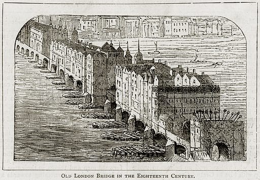 By the twelfth century, a once thought permanent stone bridge emerged under the watchful eye of Peter de Colechurch. De Colechurch was a priest at St. Mary’s who began the construction of the foundation for the first stone arch (London) bridge in 1776. When completed in 1209, this medieval bridge became famous for its rows of shops and houses, turning a crossing of the river into a chaotic experience through a neighborhood suspended high above the river.