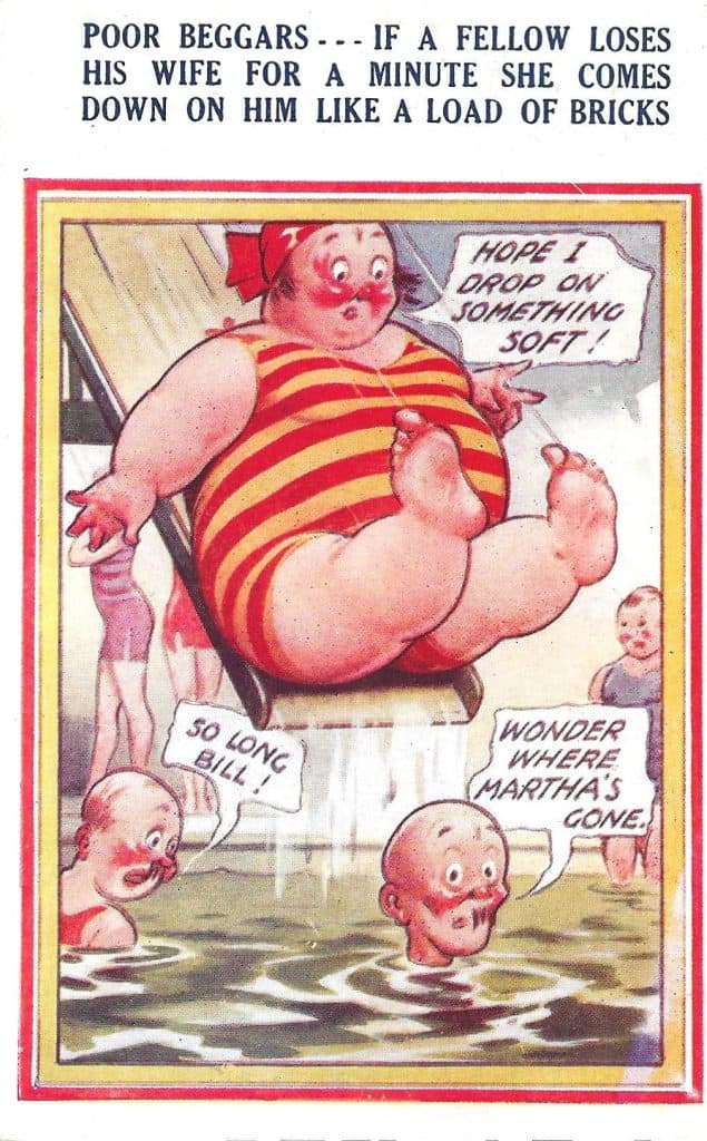 For decades, saucy postcards were policed by local councils and the Home Office. Artists like McGill were actually prosecuted in the 1950s for “obscenity.” His crimes were “drawing large women bending over,” “husbands ogling other women,” and poking fun at or about underwear, corsets, and bathing suits.