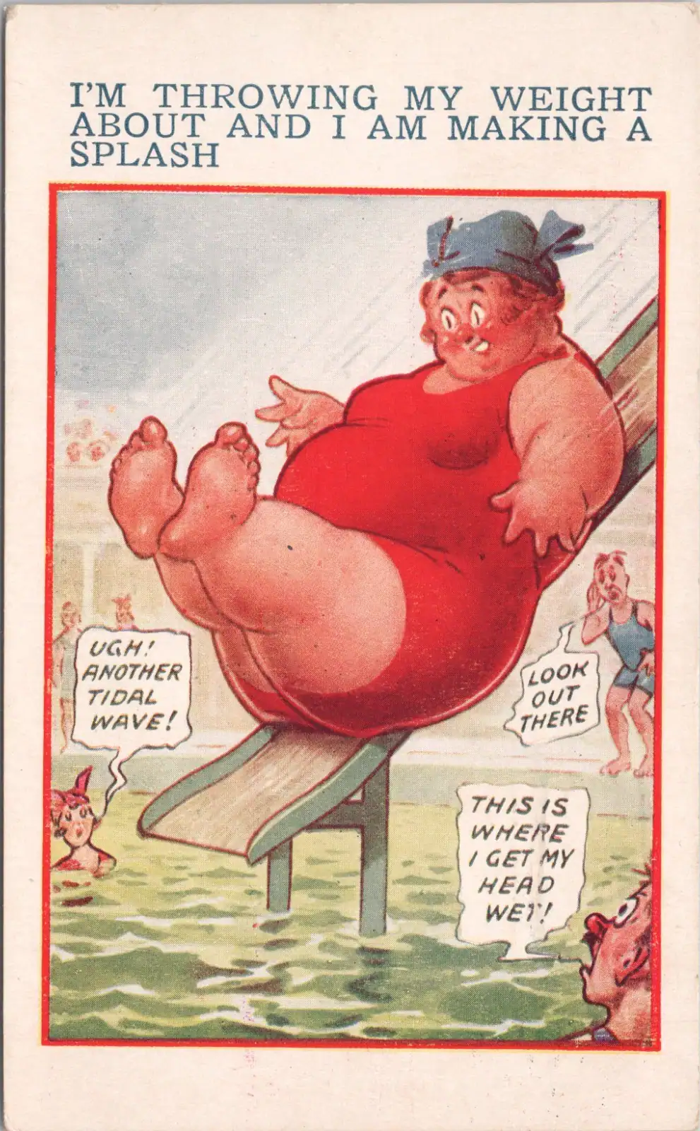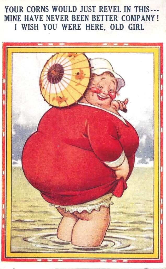 The English more so than the Scots and Welsh often enjoy laughing at themselves. The big‑bottom postcard lets them say, “Well, aren’t we looking a bit ridiculous on holiday,” “Look at us stuffing ourselves with fish and chips,” or “No one here is taking himself too seriously.”