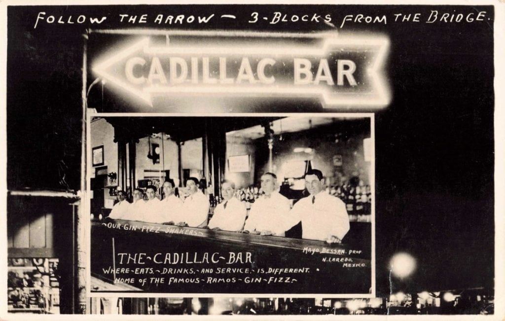 Follow The Arrow—3 Blocks from the Bridge. Cadillac Bar Where Eats, Drinks, and Service Is Different. Home of the Famous Ramos Gin Fizz. Mayo Bessan, Prop., N[uevo] Laredo, Mexico, circa 1941.