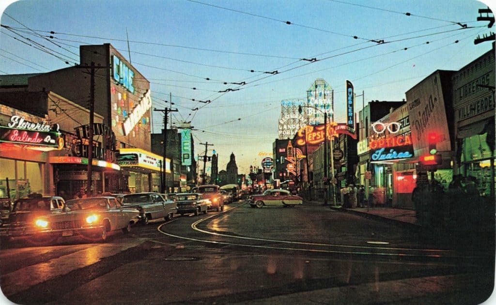 Starting in the background center, this view captures the new twin belfries of the Guadalupe Church facing the plaza. On each side of the street are tall buildings and a sea of neon signs. The streetcar system, first installed in the town during the late nineteenth century, was still serving Juárez, although it likely battled with the increased automobile traffic that swamped the city where the population increased from some 20,000 in 1920 to more than 276,000 by 1960.