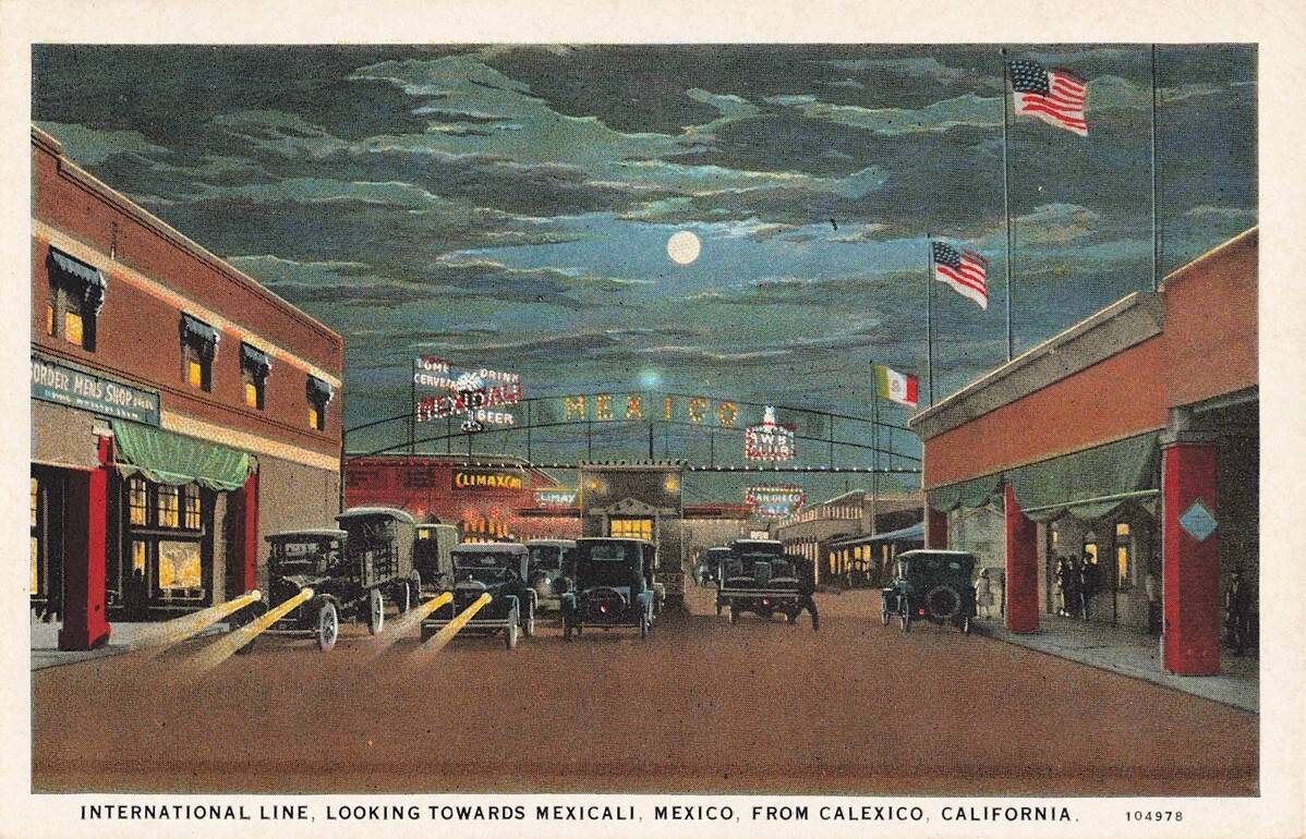 Mexicali, Baja California, abuts Calexico, California at their international boundary. By the second decade of the twentieth century during American Prohibition, the Mexican town was a bustling city of cabarets and adult entertainment venues. Visible in this early Curt Teich postcard are the Climax Club, the A.B.W. Club (also known as The Owl), and the San Diego Café. Period autos move into and out of Mexicali past a gated sentry box in the middle of the border line where an illuminated metal sign above announces Mexico.