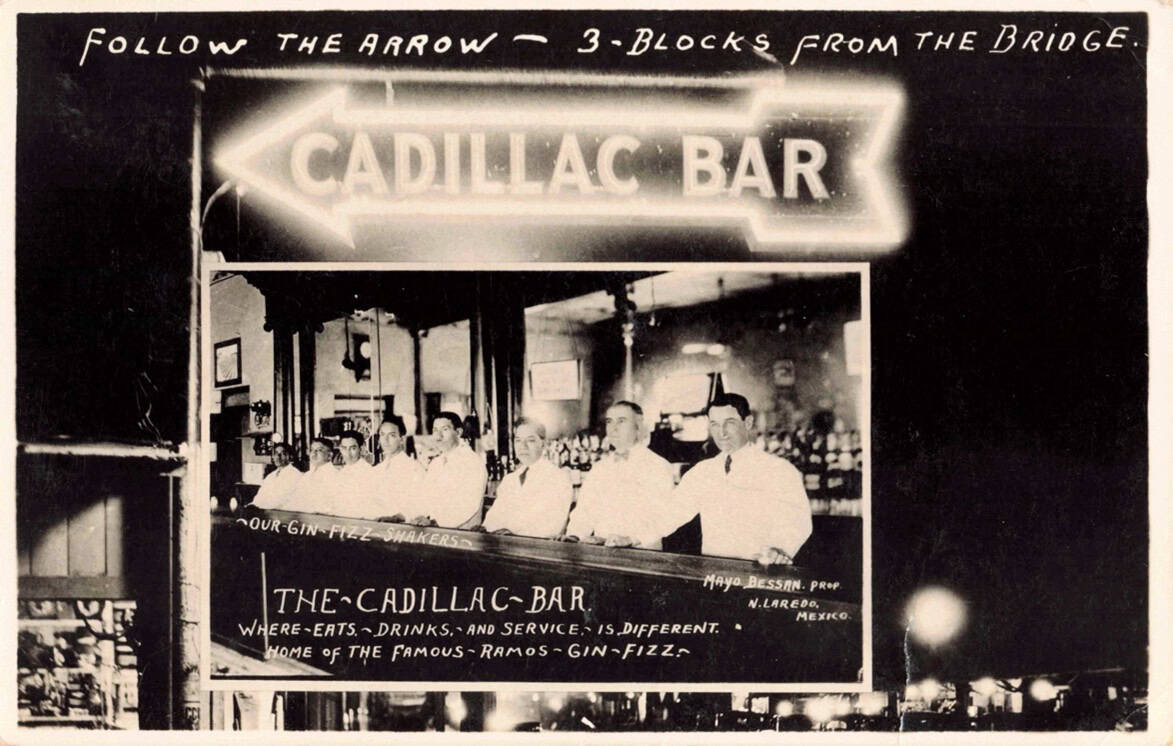 Follow The Arrow—3 Blocks from the Bridge. Cadillac Bar Where Eats, Drinks, and Service Is Different. Home of the Famous Ramos Gin Fizz. Mayo Bessan, Prop., N[uevo] Laredo, Mexico, circa 1941.