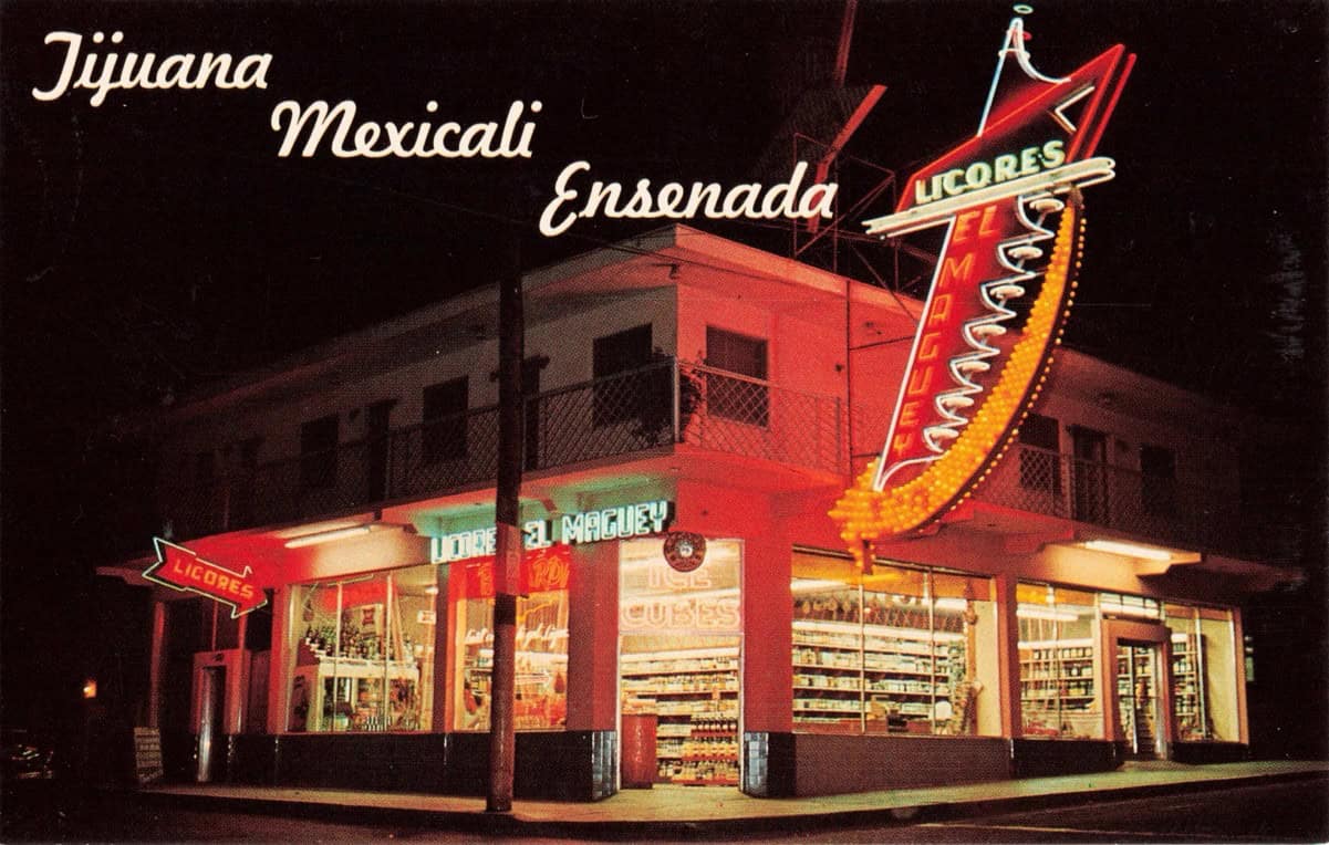 This is a 1960s chrome postcard showing Licores El Maguey, once the largest chain of liquor stores in Baja California. The dramatic night view is heightened by neon arrows directing customers to the store.