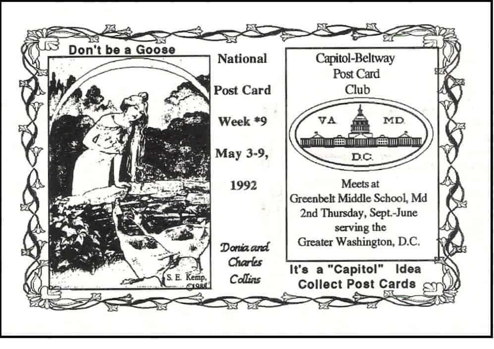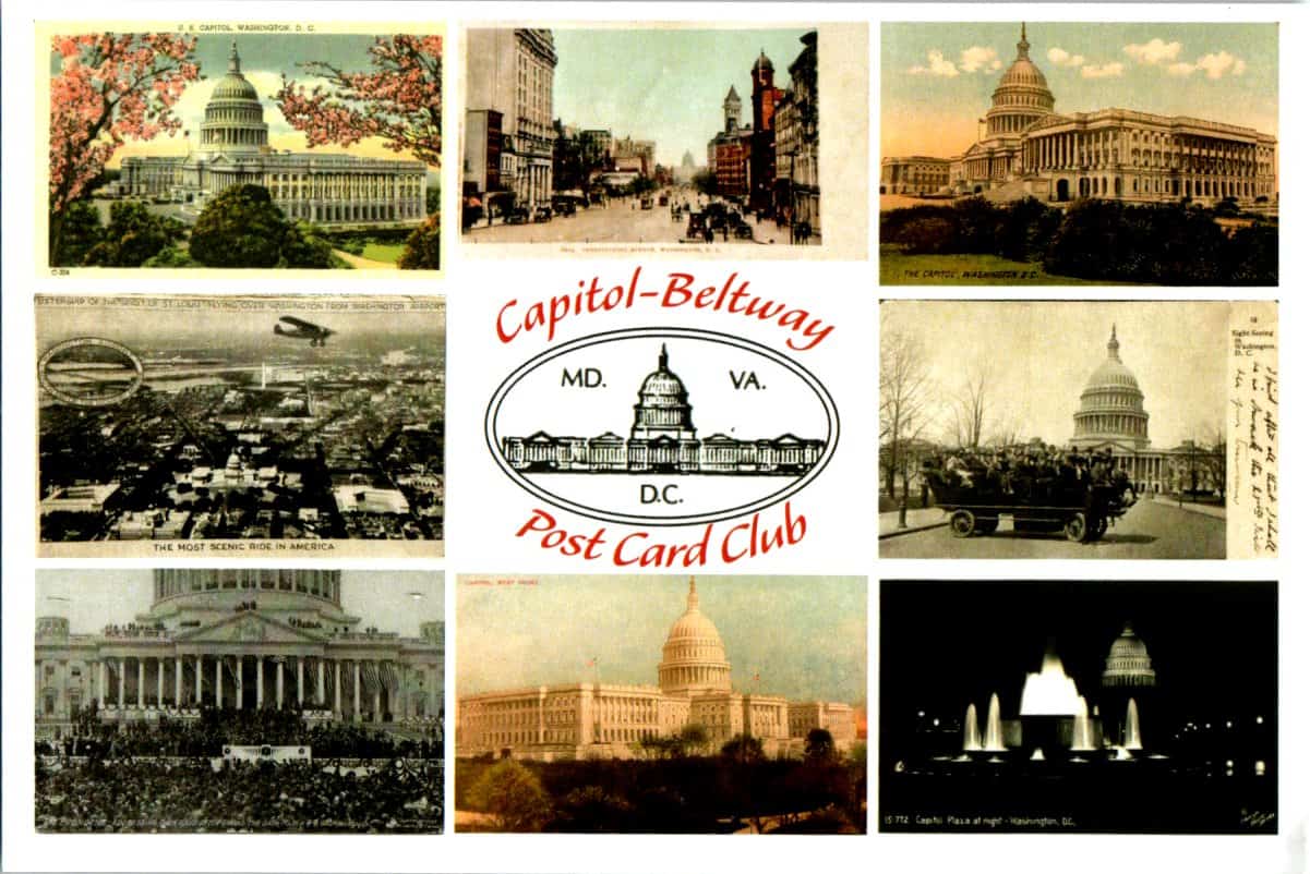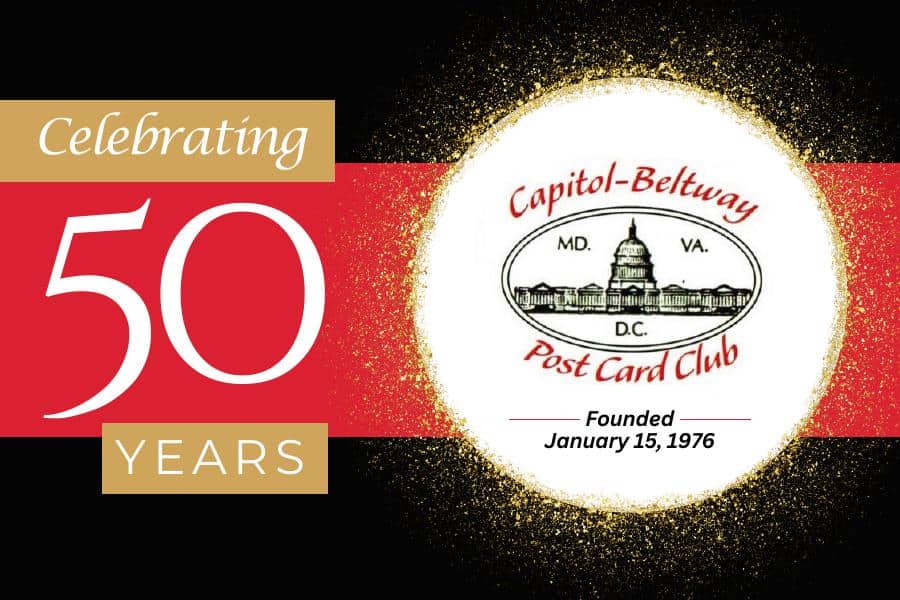 It was 1976 and our nation was celebrating its Bicentennial. Carter was elected President, Apple Computer was founded, and NASA’s Viking missions landed on Mars. Yet another event happened that year that did not make headlines! Fifty people from Maryland, Washington, DC, and Virginia met at the Greenbelt Junior High School to create a new postcard club: the Capitol-Beltway Postcard Club! The chosen logo depicted all three regions. The original officers were President Charles Collins, Vice-President Alvin Goldstein. Secretary Donia Collins, and Treasurer Neal Boyle.
