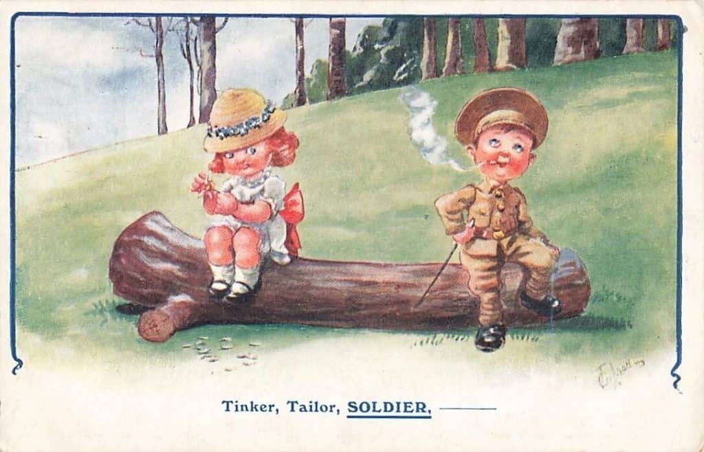 The work in question is a counting-out game, played by English, Welsch, Dutch, and Irish children as early as 1475 and reported in a William Caxton list of children’s games. Those early children used different words, but the idea was very similar. It goes, Tinker, Tailor, Soldier, Sailor, Rich Man, Poor Man, Beggar Man, Thief.