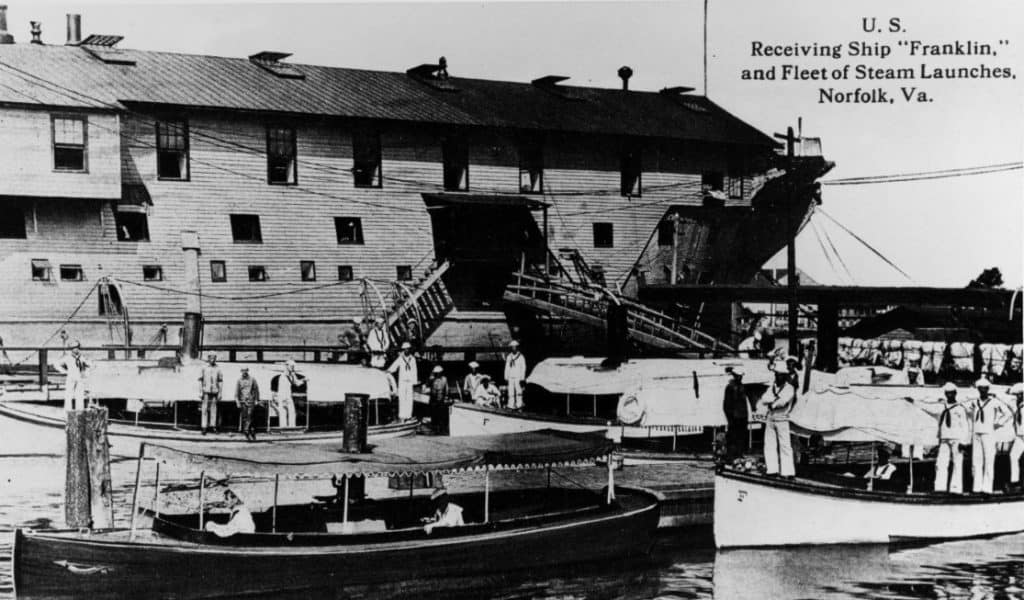 At this point these three relics of Postcard History raise questions: Was the sender, John, a member of the crew aboard the Receiving Ship USS Franklin? Or, was he a crew member on the battleship Illinois? The ship pictured on Exhibit #1. Was the Illinois at Norfolk at the time the card was postmarked? These are difficult to answer without knowing the exact date that is unreadable on Exhibit #2.