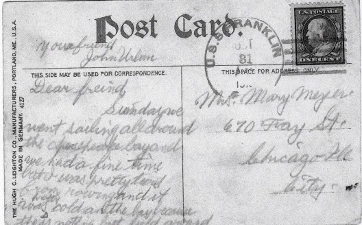I came across this Hugh C. Leighton Company postcard in January. It was published in Portland, Maine but manufactured in Germany. The card was posted from the USS Franklin on October 31, but alas the year in the postmark is unreadable, though likely in the early years of the last century. The addressee was Mrs. Mary Meyer in Chicago, Illinois.