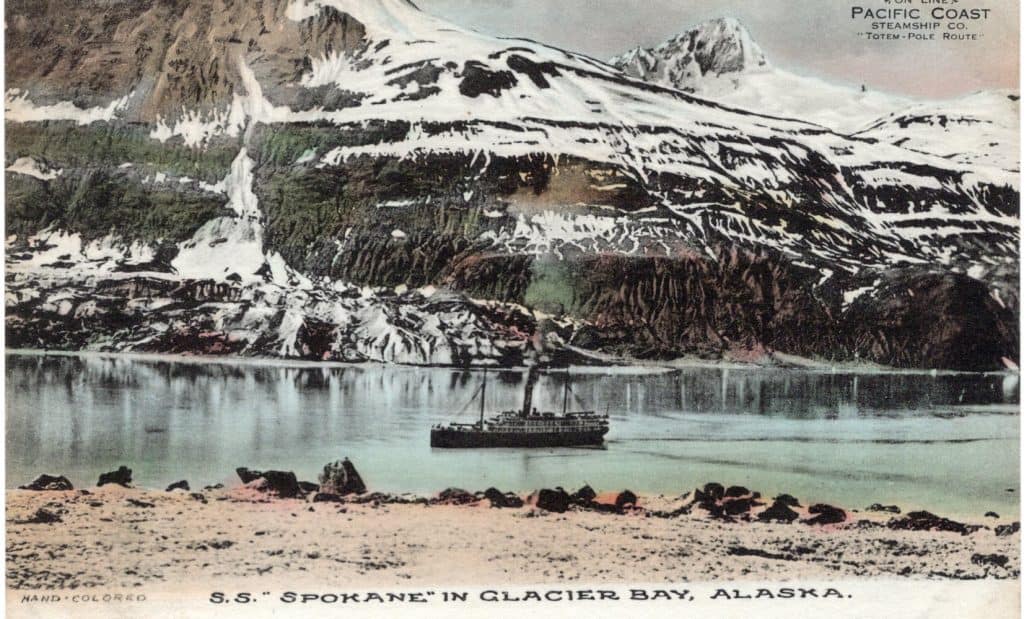The company’s steamship to Alaska, the SS Spokane was described in the advertising as “palatial,” made at least six round trips from early June to mid-August. The voyage was for eleven days, with stops in Ketchikan, Wrangel, Sitka, Juneau, Skagway, Treadwell Mine, Metlakatla, Taku Glacier, Davidson Glacier, Brady Glacier, and Muir Glacier.